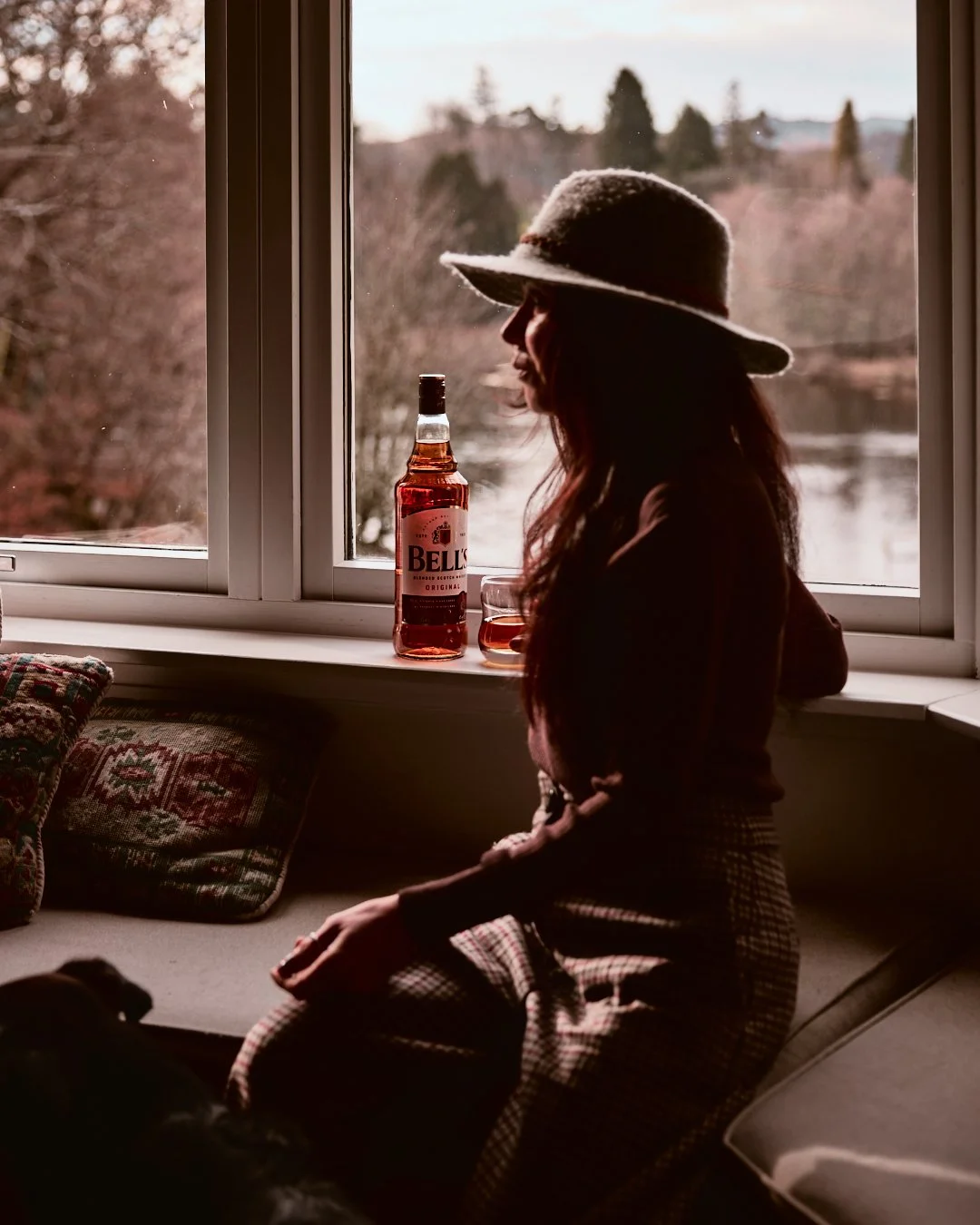 • Seated by a window with a warm drink, light filtering through misty glass.